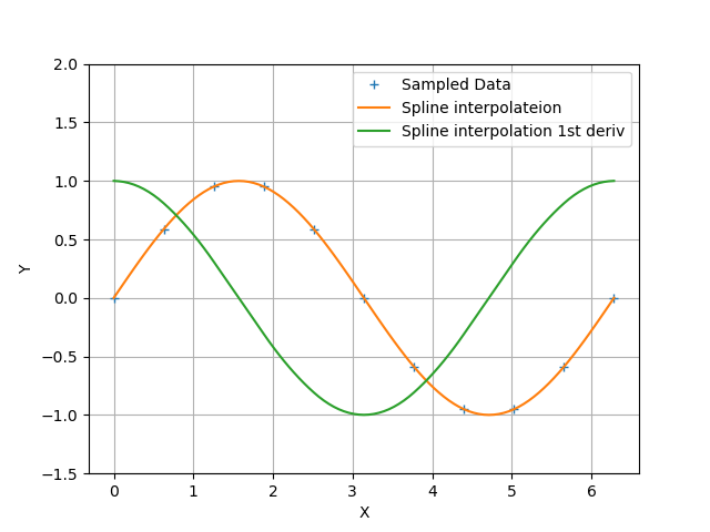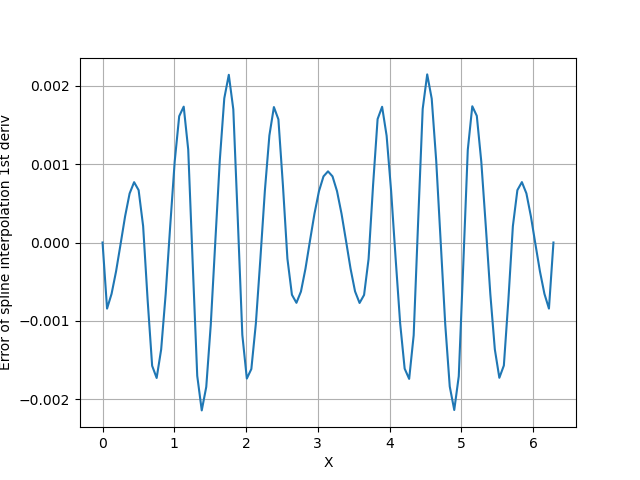 0 ~ 2pi 구간에서 약 ±0.002 수준의 잔차가 발생함을 알 수 있습니다. 우리가 11개의 데이터를 이용해서 spline interpolation을 진행한 후 1계 도함수를 계산할 경우 소수점 2번째까지 믿을 수 있는 데이터를 확보한다는 뜻입니다.