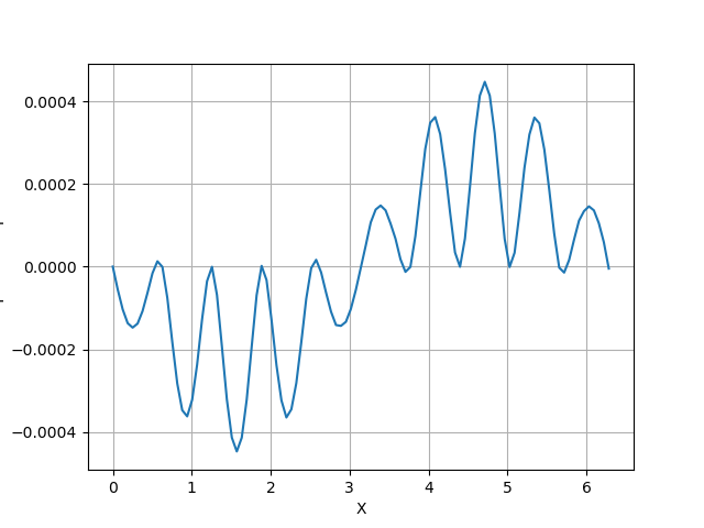 0 ~ 2pi 구간에서 약 ±0.0004 수준의 잔차가 발생함을 알 수 있습니다. 이런 결과는 우리가 11개의 데이터를 이용해서 spline interpolation을 진행할 경우 소수점 3번째 자리까지는 확실한 데이터임을 알 수 있습니다.